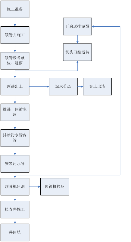 作为本次工程项目运用泥水平衡顶管机的施����� �������Ƴ������������ �������Ƴ������������ �������Ƴ������������ �������Ƴ�������工技术工艺流程图,前期准备、工作井、接收井施����� �������Ƴ������������ �������Ƴ������������ �������Ƴ������������ �������Ƴ�������工、设备就位、安装止水胶圈、进洞、顶进出土����� �������Ƴ������������ �������Ƴ������������ �������Ƴ������������ �������Ƴ�������、分离泥水、回缩主顶、安装顶����� �������Ƴ������������ �������Ƴ����������� �������Ƴ����������� �������Ƴ�������管、顶管机出洞转场,进行����� �������Ƴ����������� �������Ƴ������������ �������Ƴ����������� �������Ƴ�������检查井施工后回填。