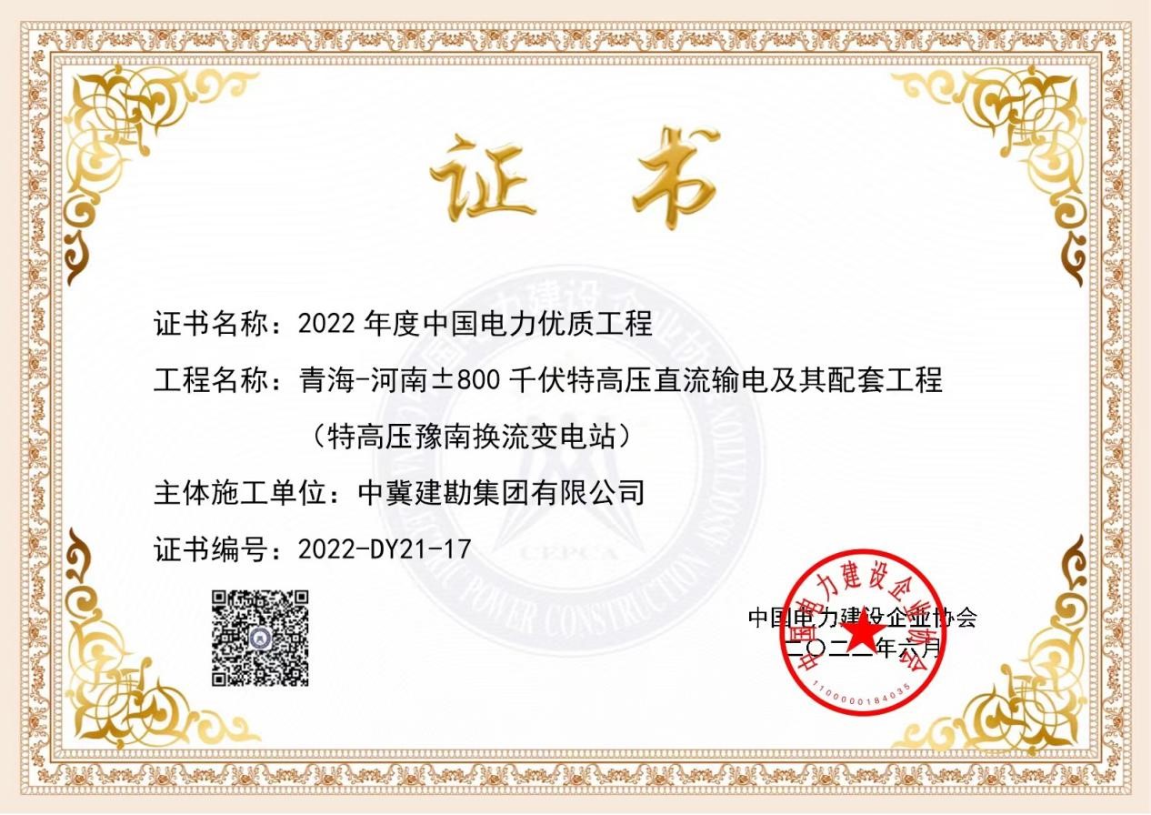 豫南换流站项目荣获2022年度中国电力����� �������Ƴ����������� �������Ƴ������������ �������Ƴ������������ �������Ƴ�������行业优质工程奖