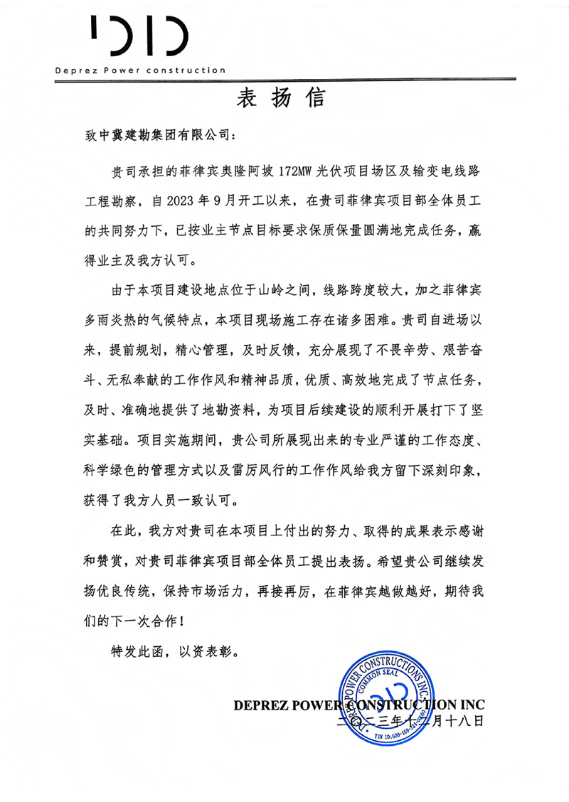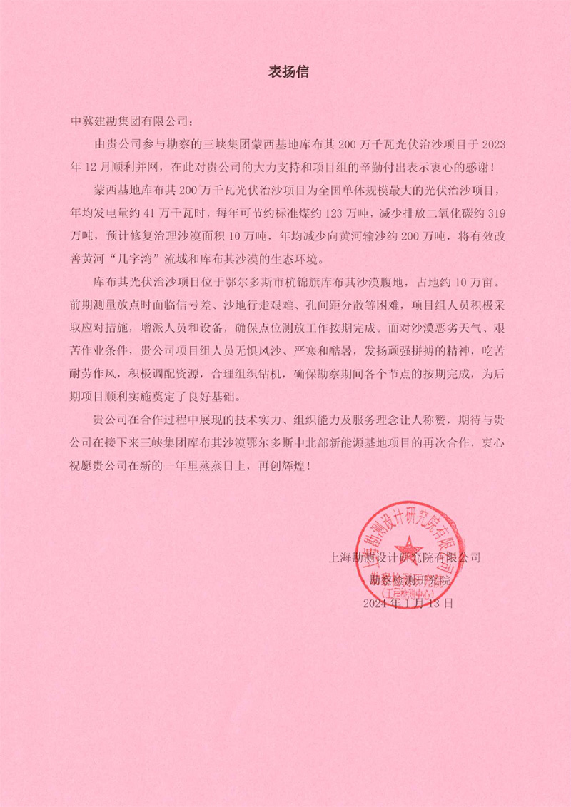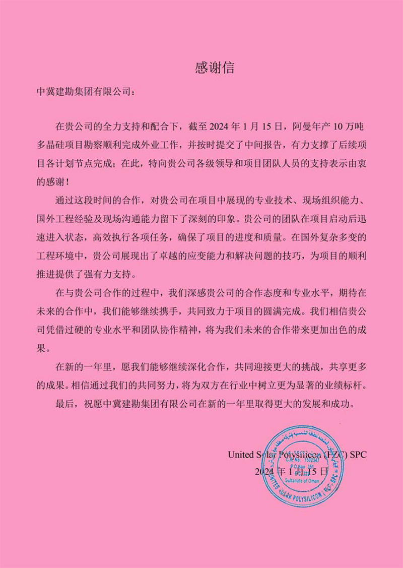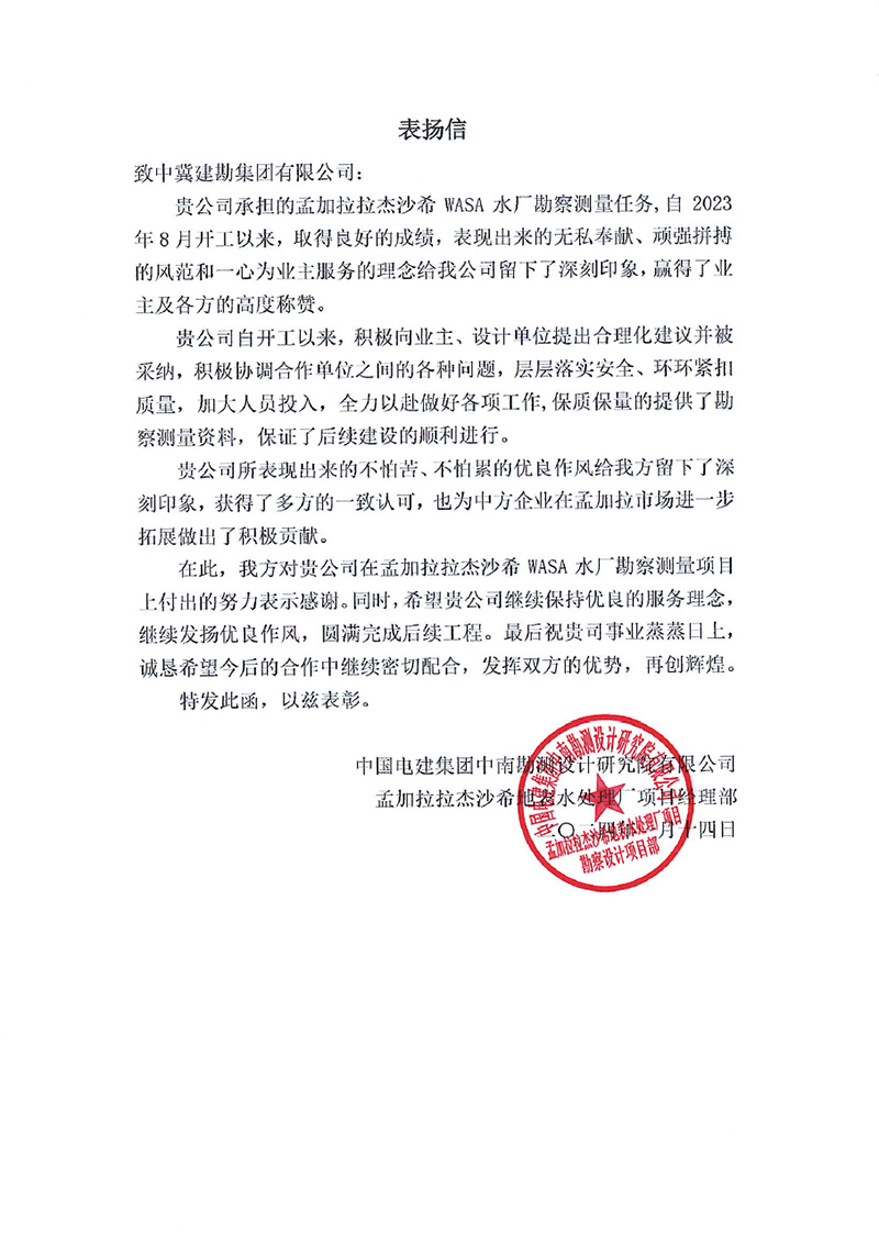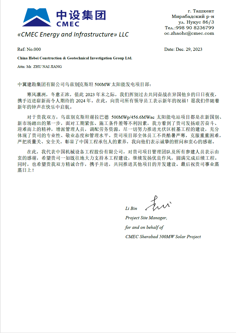 &n����� �������Ƴ������������ �������Ƴ������������ �������Ƴ������������ �������Ƴ�������bsp;  中国机械设备工程股份有限����� �������Ƴ������������ �������Ƴ������������ �������Ƴ������������ �������Ƴ�������公司发来的表扬信,对在乌兹别克����� �������Ƴ����������� �������Ƴ������������ �������Ƴ������������ �������Ƴ�������斯坦谢拉巴德 500MWp/456.6MW����� �������Ƴ������������ �������Ƴ������������ �������Ƴ������������ �������Ƴ�������ac 太阳能电站项目建设����� �������Ƴ������������ �������Ƴ������������ �������Ƴ������������ �������Ƴ�������过程中,项目全体人员克服诸多不利因素,发����� �������Ƴ������������ �������Ƴ������������ �������Ƴ������������ �������Ƴ�������扬建勘精神,尽一切努力推进����� �������Ƴ������������ �������Ƴ������������ �������Ƴ����������� �������Ƴ�������工程建设,以及公司的专业性、敬业态度����� �������Ƴ����������� �������Ƴ������������ �������Ƴ����������� �������Ƴ�������和管理水平给予了高度评价。同时,对项目管理团队����� �������Ƴ������������ �������Ƴ������������ �������Ƴ������������ �������Ƴ�������及所有参建人员表示由衷的感谢,并����� �������Ƴ������������ �������Ƴ������������ �������Ƴ������������ �������Ƴ�������希望双方精诚合作,携手并进,共����� �������Ƴ������������ �������Ƴ������������ �������Ƴ������������ �������Ƴ�������同推进其他项目的开发建设。