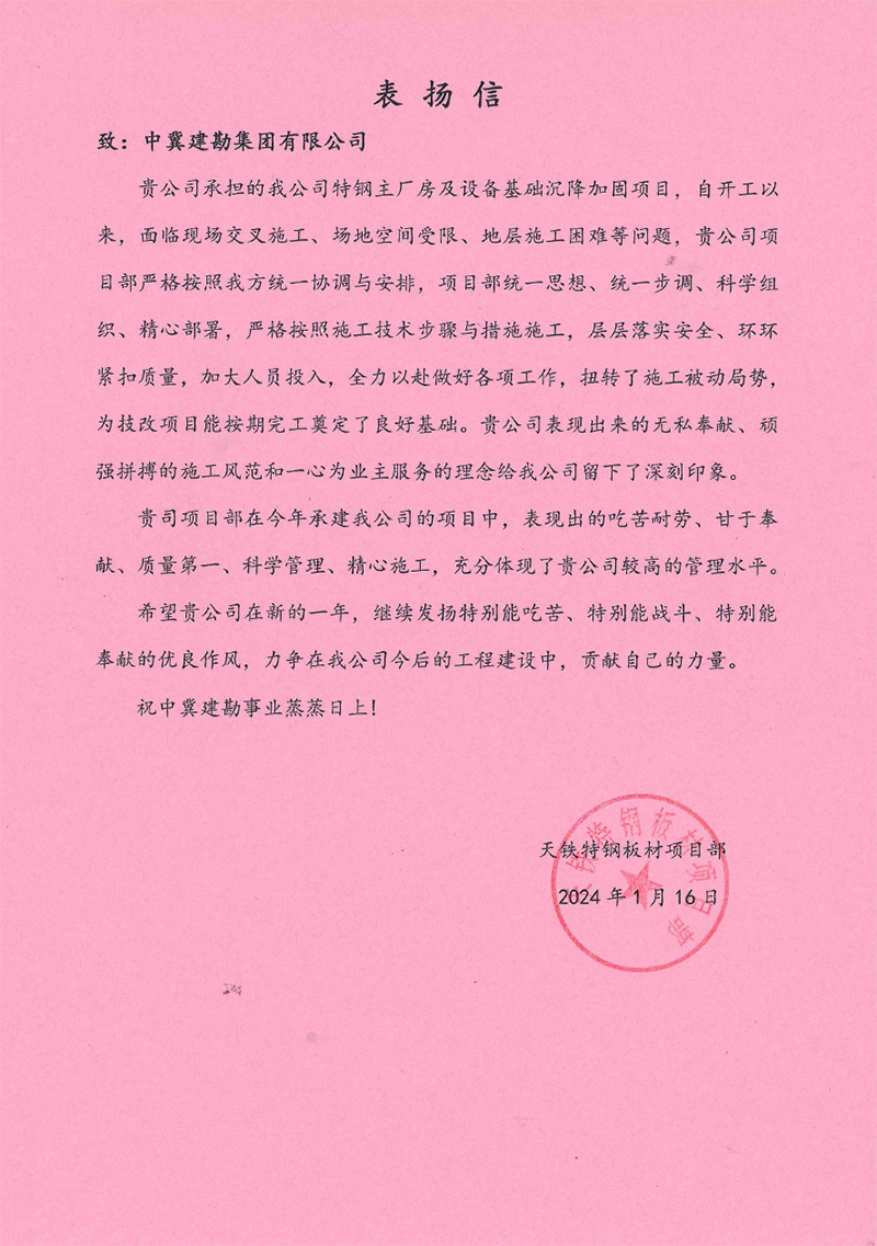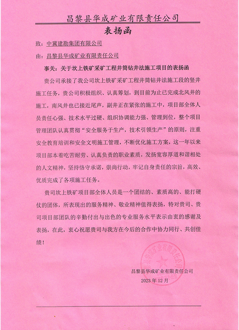 昌黎县华成矿业有限责任公司发来����� �������Ƴ������������ �������Ƴ������������ �������Ƴ����������� �������Ƴ�������的表扬函,对我公司在坎上����� �������Ƴ������������ �������Ƴ������������ �������Ƴ������������ �������Ƴ�������铁矿采矿工程井筒钻进法施工项目施工过程中,积极组����� �������Ƴ������������ �������Ƴ����������� �������Ƴ������������ �������Ƴ�������织,认真筹划,以及项目部全体人员����� �������Ƴ����������� �������Ƴ����������� �������Ƴ������������ �������Ƴ�������责任心强、技术水平过硬、组织协调能����� �������Ƴ������������ �������Ƴ������������ �������Ƴ������������ �������Ƴ�������力强、管理到位,认真贯彻“安全����� �������Ƴ������������ �������Ƴ������������ �������Ƴ������������ �������Ƴ�������服务于生产,技术引领生产”的原则,不����� �������Ƴ������������ �������Ƴ������������ �������Ƴ����������� �������Ƴ�������断优化施工方案,已顺利完成北风井的施工,南风井����� �������Ƴ������������ �������Ƴ����������� �������Ƴ������������ �������Ƴ�������也即将完成,表示由衷的感����� �������Ƴ������������ �������Ƴ������������ �������Ƴ������������ �������Ƴ�������谢和表扬,希望今后合作中协力同行、共创佳绩。����� �������Ƴ����������� �������Ƴ������������ �������Ƴ������������ �������Ƴ�������