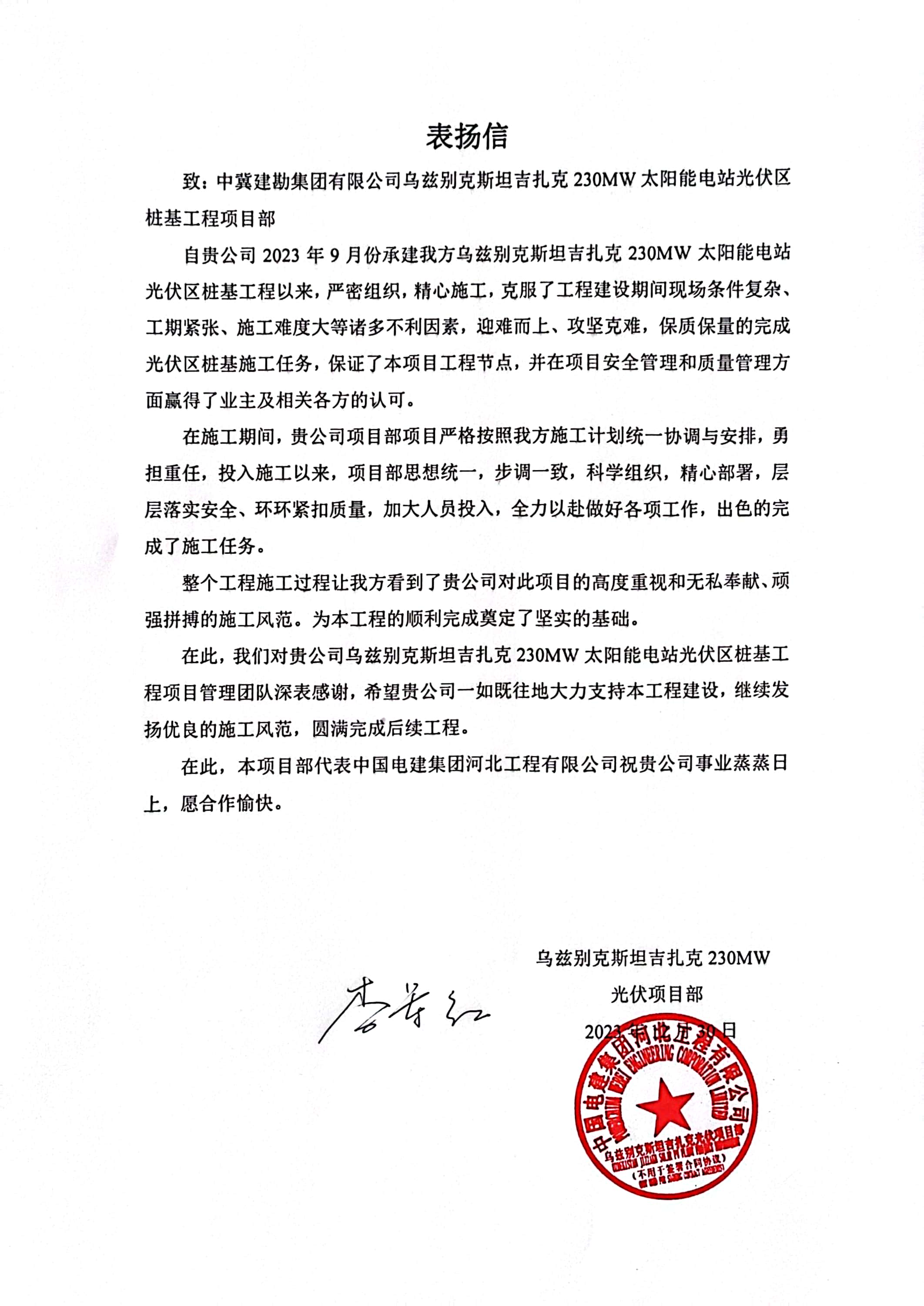 中能建建筑集团有限公司发来的表扬信����� �������Ƴ������������ �������Ƴ������������ �������Ƴ������������ �������Ƴ�������,对在乌兹别克斯坦布哈拉州500M����� �������Ƴ������������ �������Ƴ������������ �������Ƴ������������ �������Ƴ�������W光伏项目建设过程中,项目部全体人员发扬“����� �������Ƴ������������ �������Ƴ������������ �������Ƴ������������ �������Ƴ�������一不等,二不靠”的服务理念,克服工作环境和地质复����� �������Ƴ����������� �������Ƴ������������ �������Ƴ������������ �������Ƴ�������杂等困难,在公司的大力支持和项目全体人员的����� �������Ƴ������������ �������Ƴ������������ �������Ƴ������������ �������Ƴ�������共同努力下,圆满完成了项目要求的节点目标,特向����� �������Ƴ������������ �������Ƴ������������ �������Ƴ������������ �������Ƴ������我公司表示衷心的感谢和诚挚的问候,愿今后继����� �������Ƴ������������ �������Ƴ������������ �������Ƴ������������ �������Ƴ�������续精诚合作,共铸辉煌。