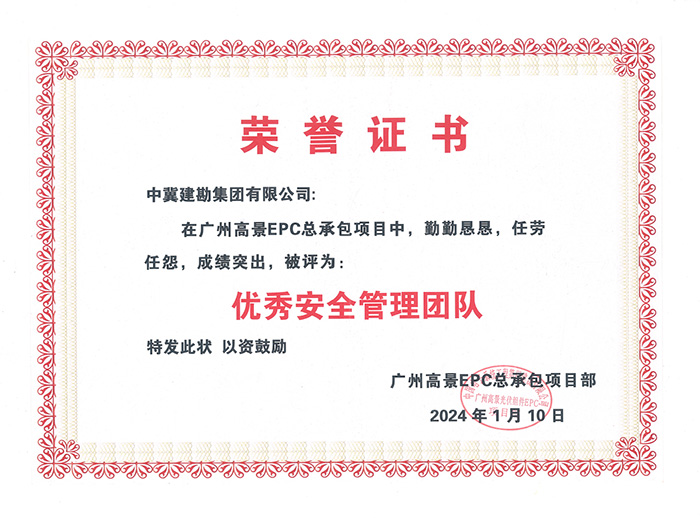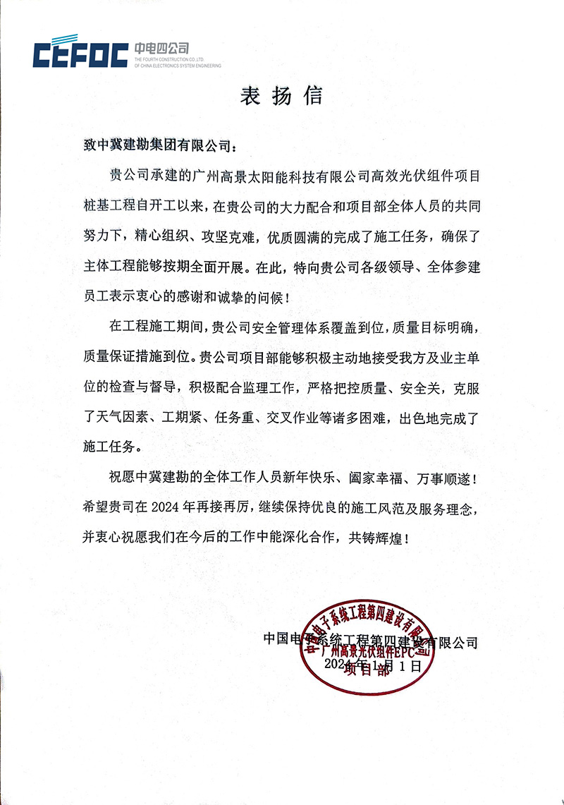 中国电子系统工程第四建设有限公司����� �������Ƴ������������ �������Ƴ������������ �������Ƴ������������ �������Ƴ�������发来的表扬信,对我公司在广州高景太����� �������Ƴ������������ �������Ƴ������������ �������Ƴ������������ �������Ƴ�������阳能科技有限公司高效光伏����� �������Ƴ������������ �������Ƴ������������ �������Ƴ������������ �������Ƴ�������组件项目建设过程中,公司的大力配合����� �������Ƴ������������ �������Ƴ������������ �������Ƴ������������ �������Ƴ�������和项目部全体人员的共同努力下,安全管理体系����� �������Ƴ������������ �������Ƴ������������ �������Ƴ������������ �������Ƴ�������覆盖到位,质量保证措施到位,����� �������Ƴ������������ �������Ƴ������������ �������Ƴ������������ �������Ƴ�������严格把控质量、安全关,出色完成了����� �������Ƴ������������ �������Ƴ����������� �������Ƴ������������ �������Ƴ������施工任务,特向我公司各级领导、全体参建员工����� �������Ƴ������������ �������Ƴ������������ �������Ƴ������������ �������Ƴ�������表示衷心的感谢,并授予“����� �������Ƴ������������ �������Ƴ������������ �������Ƴ������������ �������Ƴ�������优秀安全管理团队”和“优秀资料包商”����� �������Ƴ������������ �������Ƴ����������� �������Ƴ������������ �������Ƴ�������荣誉。